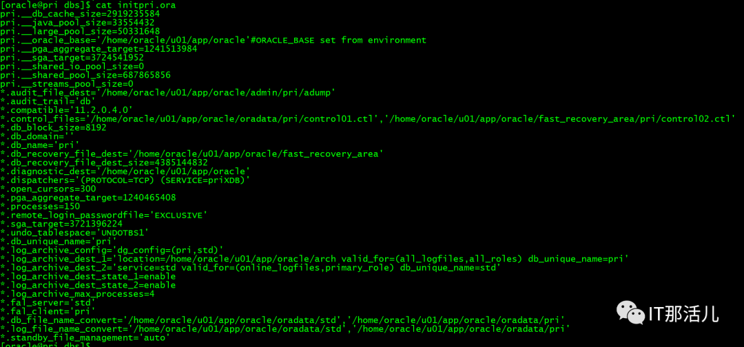 pri.__db_cache_size=2919235584pri.__java_pool_size=33554432pri.__large_pool_size=50331648pri.__oracle_base='/home/oracle/u01/app/oracle'#ORACLE_BASE set from environmentpri.__pga_aggregate_target=1241513984pri.__sga_target=3724541952pri.__shared_io_pool_size=0pri.__shared_pool_size=687865856pri.__streams_pool_size=0*.audit_file_dest='/home/oracle/u01/app/oracle/admin/pri/adump'*.audit_trail='db'*.compatible='11.2.0.4.0'*.control_files='/home/oracle/u01/app/oracle/oradata/pri/control01.ctl','/home/oracle/u01/app/oracle/fast_recovery_area/pri/control02.ctl'*.db_block_size=8192*.db_domain=''*.db_name='pri'*.db_recovery_file_dest='/home/oracle/u01/app/oracle/fast_recovery_area'*.db_recovery_file_dest_size=4385144832*.diagnostic_dest='/home/oracle/u01/app/oracle'*.dispatchers='(PROTOCOL=TCP) (SERVICE=priXDB)'*.open_cursors=300*.pga_aggregate_target=1240465408*.processes=150*.remote_login_passwordfile='EXCLUSIVE'*.sga_target=3721396224*.undo_tablespace='UNDOTBS1'*.db_unique_name='pri'*.log_archive_config='dg_config=(pri,std)'*.log_archive_dest_1='location=/home/oracle/u01/app/oracle/arch valid_for=(all_logfiles,all_roles) db_unique_name=pri'*.log_archive_dest_2='service=std valid_for=(online_logfiles,primary_role) db_unique_name=std'*.log_archive_dest_state_1=enable*.log_archive_dest_state_2=enable*.log_archive_max_processes=4*.fal_server='std'*.fal_client='pri'*.db_file_name_convert='/home/oracle/u01/app/oracle/oradata/std','/home/oracle/u01/app/oracle/oradata/pri'*.log_file_name_convert='/home/oracle/u01/app/oracle/oradata/std','/home/oracle/u01/app/oracle/oradata/pri'*.standby_file_management='auto'