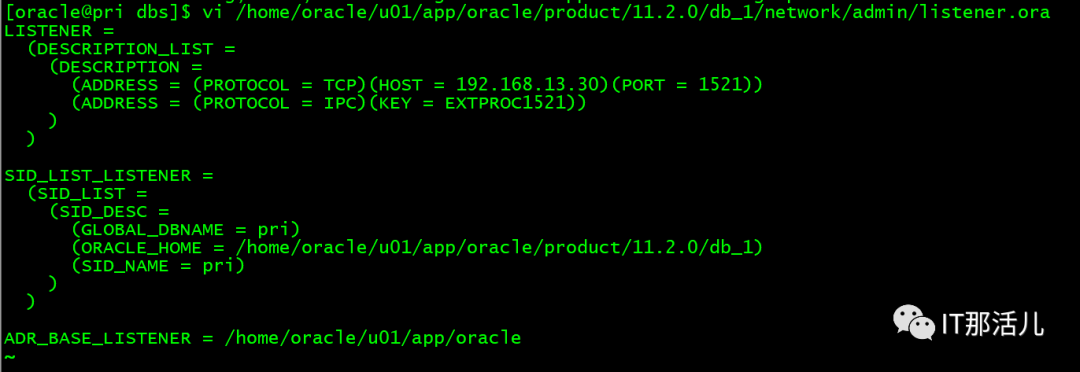 [oracle@pri dbs]$ vi /home/oracle/u01/app/oracle/product/11.2.0/db_1/network/admin/listener.oraLISTENER =(DESCRIPTION_LIST =(DESCRIPTION =(ADDRESS = (PROTOCOL = TCP)(HOST = 192.168.13.30)(PORT = 1521))(ADDRESS = (PROTOCOL = IPC)(KEY = EXTPROC1521))))SID_LIST_LISTENER =(SID_LIST =(SID_DESC =(GLOBAL_DBNAME = pri)(ORACLE_HOME = /home/oracle/u01/app/oracle/product/11.2.0/db_1)(SID_NAME = pri)))ADR_BASE_LISTENER = /home/oracle/u01/app/oracle~