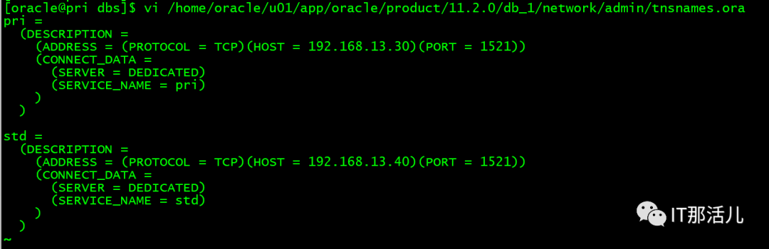 [oracle@pri dbs]$ vi /home/oracle/u01/app/oracle/product/11.2.0/db_1/network/admin/tnsnames.orapri =(DESCRIPTION =(ADDRESS = (PROTOCOL = TCP)(HOST = 192.168.13.30)(PORT = 1521))(CONNECT_DATA =(SERVER = DEDICATED)(SERVICE_NAME = pri)))std =(DESCRIPTION =(ADDRESS = (PROTOCOL = TCP)(HOST = 192.168.13.40)(PORT = 1521))(CONNECT_DATA =(SERVER = DEDICATED)(SERVICE_NAME = std)))