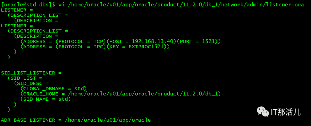 [oracle@std dbs]$ vi /home/oracle/u01/app/oracle/product/11.2.0/db_1/network/admin/listener.oraLISTENER =(DESCRIPTION_LIST =(DESCRIPTION =LISTENER =(DESCRIPTION_LIST =(DESCRIPTION =(ADDRESS = (PROTOCOL = TCP)(HOST = 192.168.13.40)(PORT = 1521))(ADDRESS = (PROTOCOL = IPC)(KEY = EXTPROC1521))))SID_LIST_LISTENER =(SID_LIST =(SID_DESC =(GLOBAL_DBNAME = std)(ORACLE_HOME = /home/oracle/u01/app/oracle/product/11.2.0/db_1)(SID_NAME = std)))ADR_BASE_LISTENER = /home/oracle/u01/app/oracle