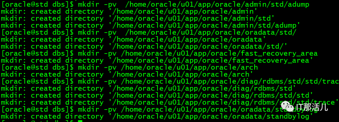 [oracle@std dbs]$ mkdir -pv /home/oracle/u01/app/oracle/admin/std/adump[oracle@std dbs]$ mkdir -pv /home/oracle/u01/app/oracle/oradata/std/[oracle@std dbs]$ mkdir -pv /home/oracle/u01/app/oracle/fast_recovery_area[oracle@std dbs]$ mkdir -pv /home/oracle/u01/app/oracle/arch[oracle@std dbs]$ mkdir -pv /home/oracle/u01/app/oracle/diag/rdbms/std/std/trace[oracle@std dbs]$ mkdir -pv /home/oracle/u01/app/oracle/oradata/standbylog