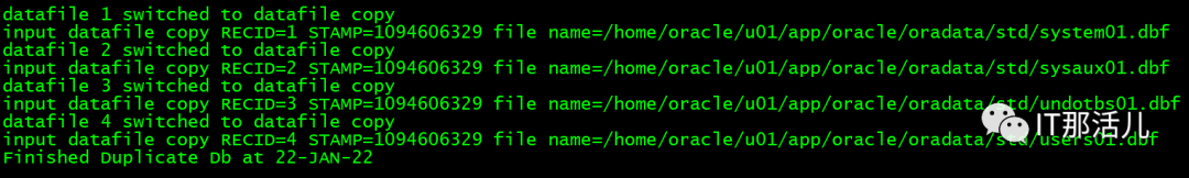 [oracle@std dbs]$ rman target sys/123456@pri auxiliary sys/123456@stdRMAN> duplicate target database for standby from active database nofilenamecheck;