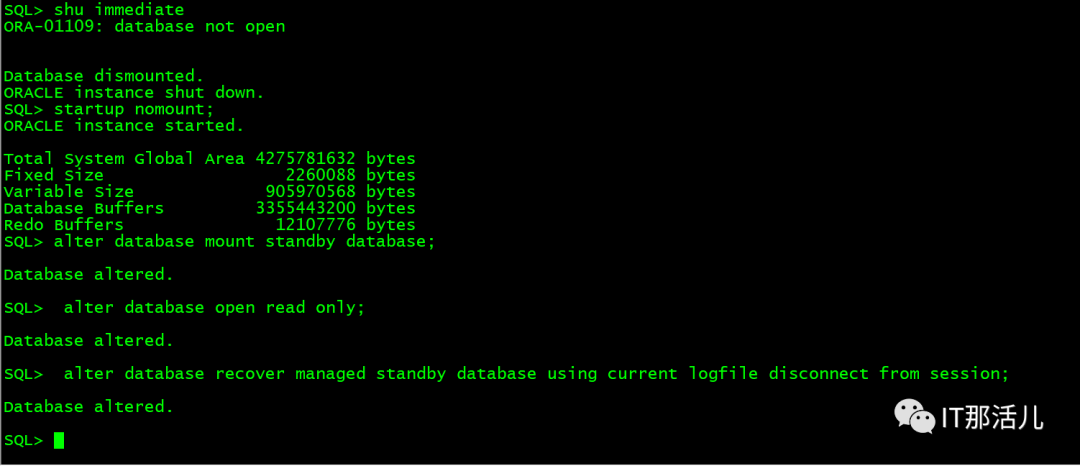 SQL> alter database recover managed standby database cancel;SQL> shu immediateSQL> alter database mount standby database;SQL> alter database open read only;SQL> alter database recover managed standby database using current logfile disconnect from session;