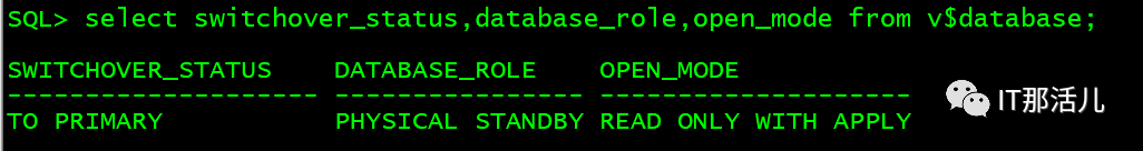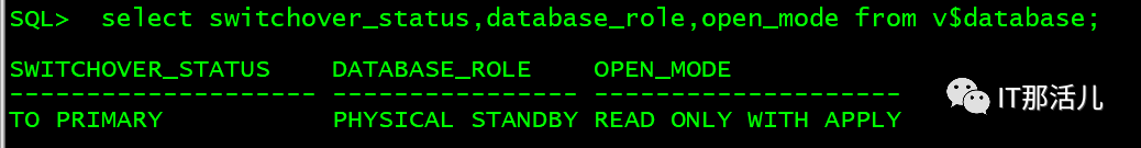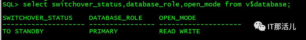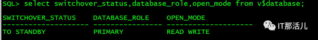 SQL> select switchover_status,database_role,open_mode from v$database;