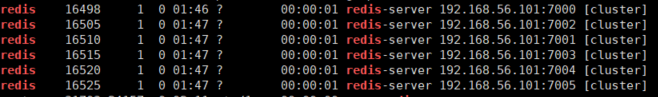 其他节点和7001类似启动,启动后进程中会标记redis节点以cluster模式启动