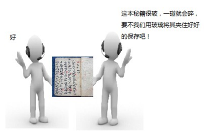 小明和小胖是好朋友,有一天他们俩得到了一份纸质版且纸比较破武功秘籍,为了让这份武功秘籍不再丢失什么内容,于是就用一个玻璃盒子存储起来。