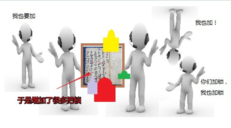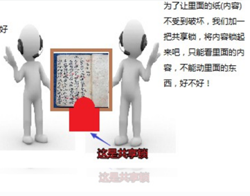 加上锁之后,大家都能看,但是不能修改,难度增大了!大家都看到你们加锁了,并且这东西是免费的,所以我也要加锁,于是这秘籍的外表框上加上了很多的锁,这些锁统称为共享锁(S)。