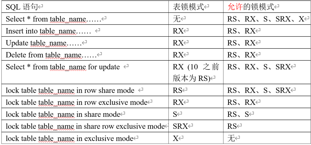下表总结了Oracle中各SQL语句产生TM锁的情况: