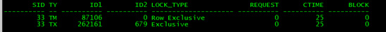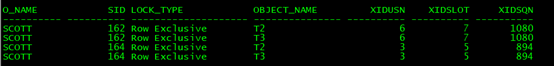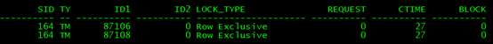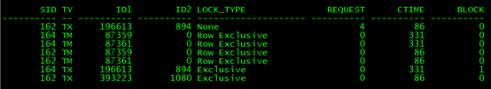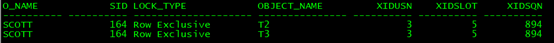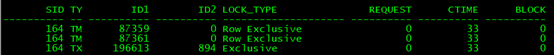 Session 1(SID为164)在t2表中先插入一条id为4的记录,session 1获得了T2,T3表上的Row Exclusive锁,及一个TX锁。