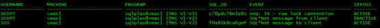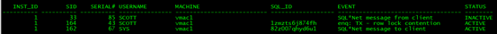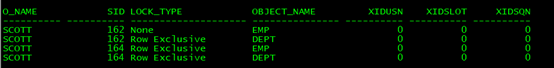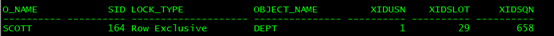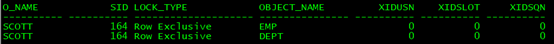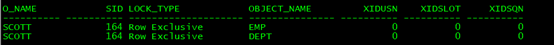 首先Session 1(SID为164)做了一个删除操作,但由于条件(0=1)为永假,所以实际上并没有一行被删除,从监控脚本可以看出Session 1在EMP,DEPT表上获得Row Exclusive锁,但由于没有实际的行被删除,所以并没有TX锁,也没有为Session 1分配回滚段。