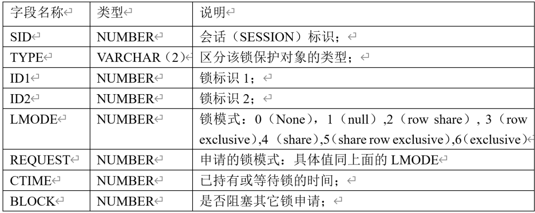 v$lock视图列出当前系统持有的或正在申请的所有锁的情况,其主要字段说明如下: