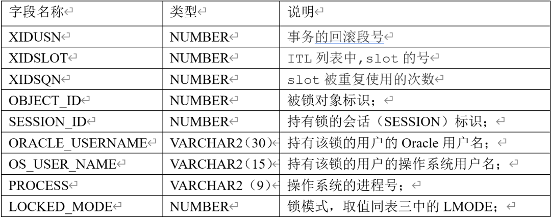 v$locked_object视图列出当前系统中哪些对象正被锁定,其主要字段说明如下: