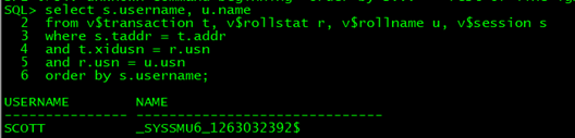 得出vlocked_object对应xidusn xidslot字段相等。同时也可以在vtransaction中查到。进而分析当拥有TX锁时,会占用相关的回滚段。同时我们也可以查到对应的回滚段信息。