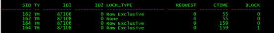 Session 2申请在EMP表上加SHARE锁(REQUEST=4),但该申请被Session 1阻塞,因为Session 1已经在EMP表上获得了Row Exclusive锁,与SHARE锁不相容。