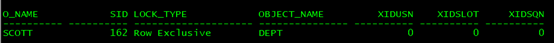 执行完SELECT…FOR UPDATE 语句后,Session 1(SID为33)在DEPT表上获得Row Exclusive锁(v$locked_object , all_objects 关联查询)