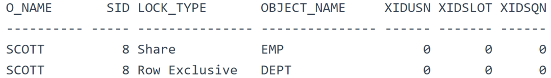 Session 2在8i版本在会在EMP表上获得Share锁,又在DEPT表上获得Row Exclusive锁。