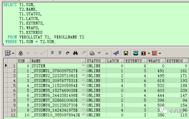 在10G以后,UNDO采用自动管理模式,下图是系统自动生成的10个段.另外一个是SYSTME的