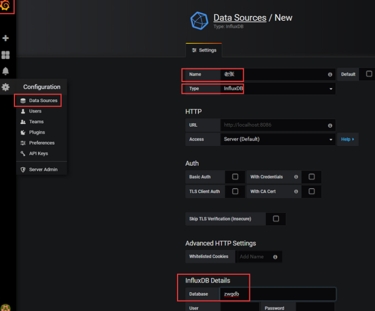 PS:选择influxdb作为数据源,需要在influxdb中创建该用户以及对应的数据库!