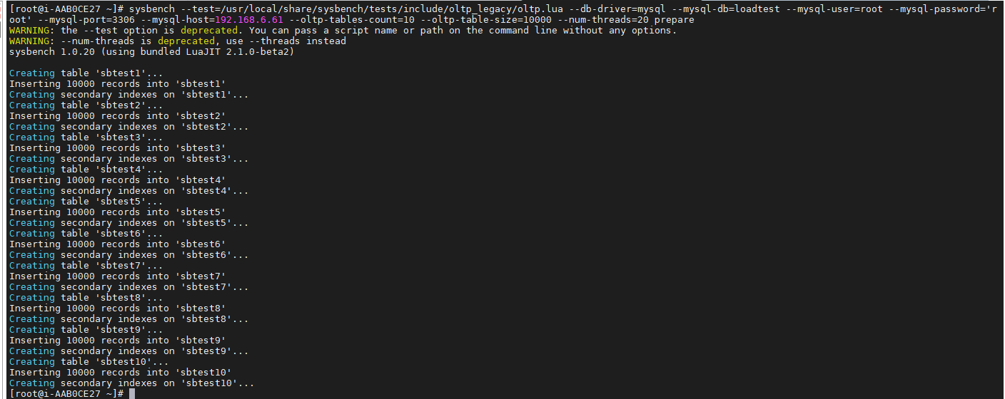 sysbench --test=/usr/local/share/sysbench/tests/include/oltp_legacy/oltp.lua --db-driver=mysql --mysql-db=loadtest --mysql-user=root --mysql-password='root' --mysql-port=3306 --mysql-host=192.168.6.61 --oltp-tables-count=10 --oltp-table-size=10000 --num-threads=20 prepare