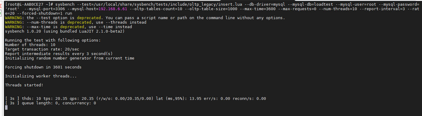 sysbench --test=/usr/local/share/sysbench/tests/include/oltp_legacy/insert.lua --db-driver=mysql --mysql-db=loadtest --mysql-user=root --mysql-password='root' --mysql-port=3306 --mysql-host=192.168.6.61 --oltp-tables-count=10 --oltp-table-size=1000 --max-time=3600 --max-requests=0 --num-threads=10 --report-interval=3 --rate=20 --forced-shutdown=1 run#初始化数据库: