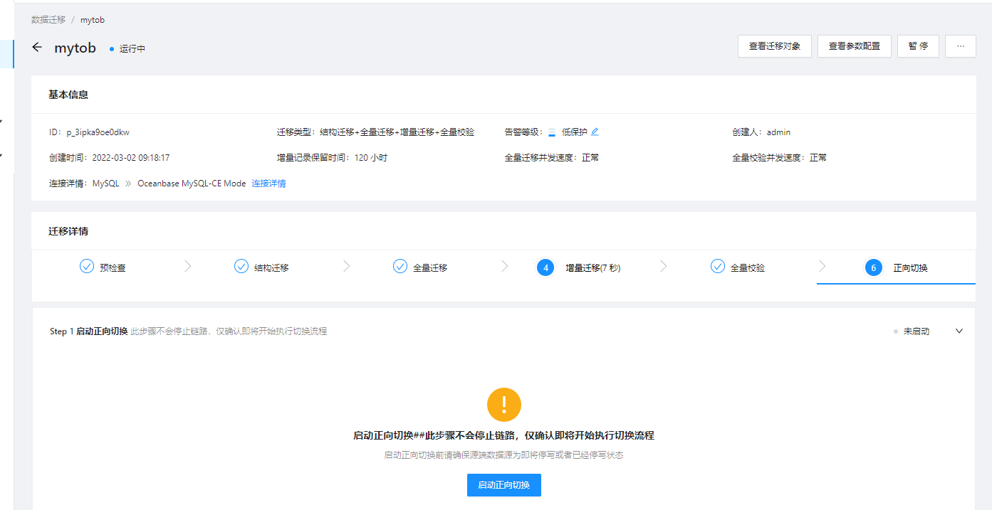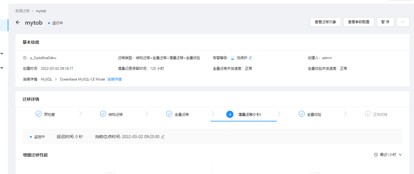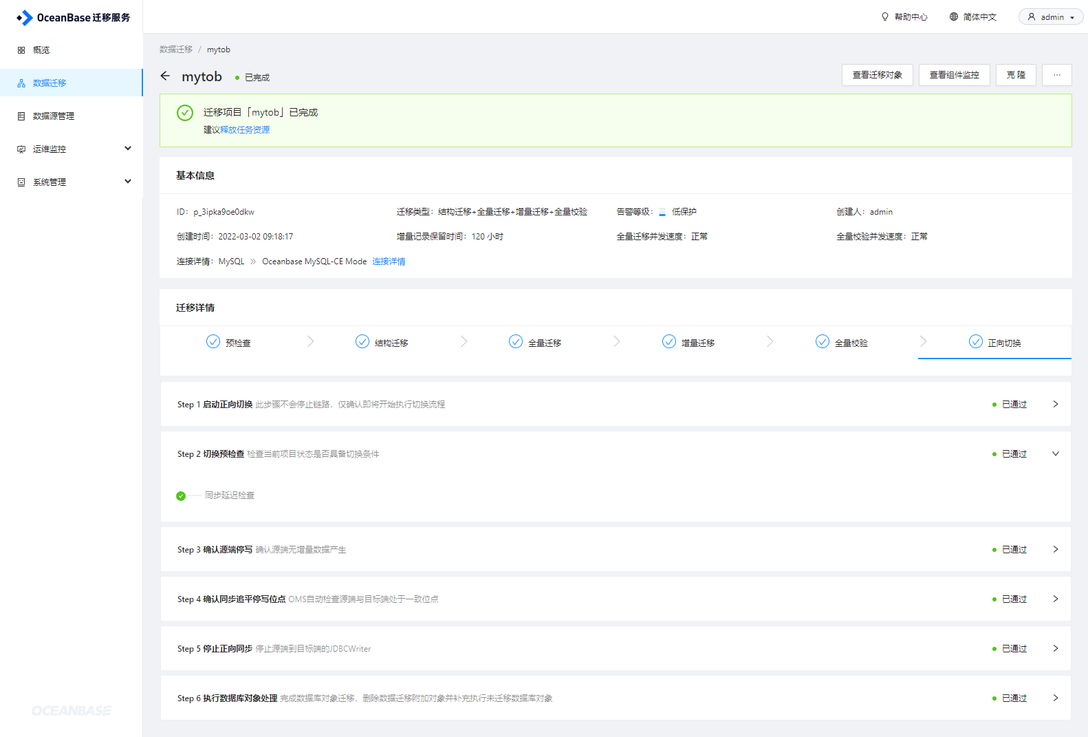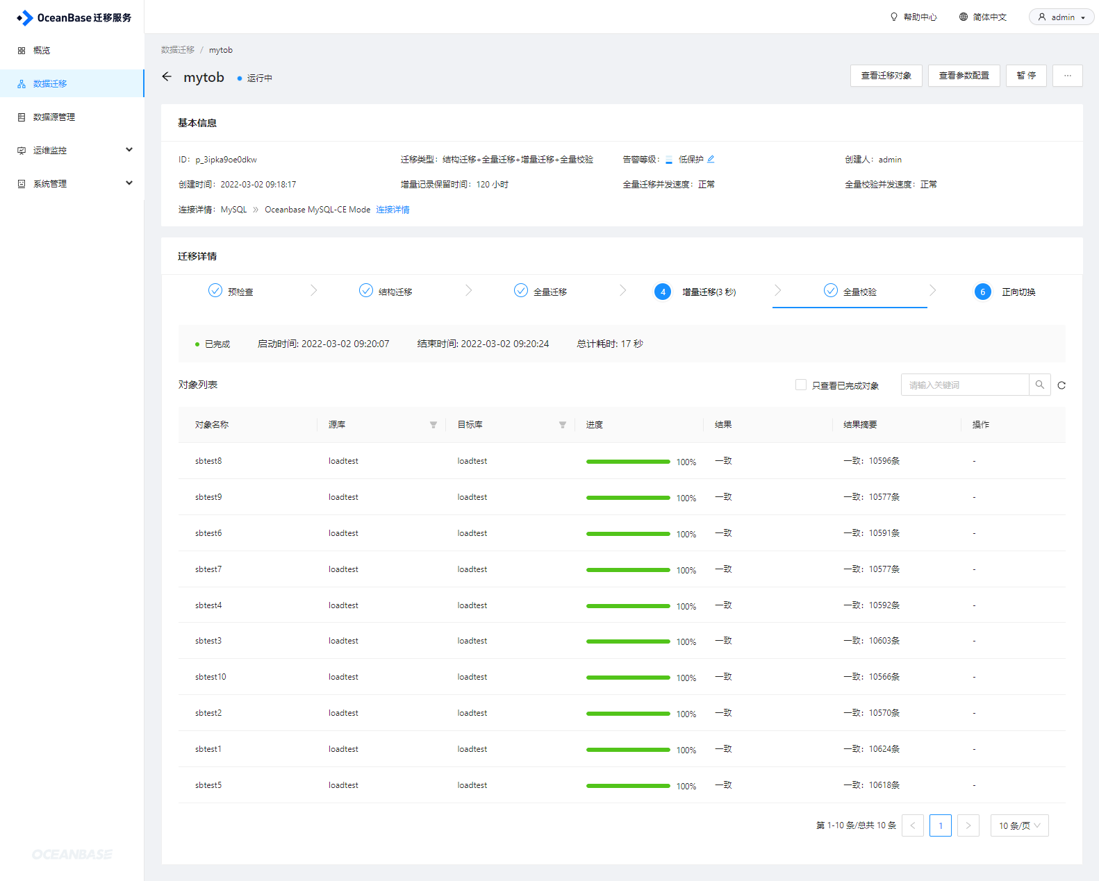 观察源数据库和目标数据库对比情况。最后一次确认数据完全一致,即全部数据迁移至OB数据库。