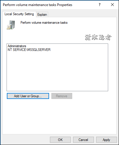 即时文件初始化功能仅在向SQL Server服务启动帐户授予了 SE_MANAGE_VOLUME_NAME 之后才可用。Windows Administrator 组的成员拥有此权限,并可以通过将其他用户添加到 执行卷维护任务 安全策略中来为其授予此权限。