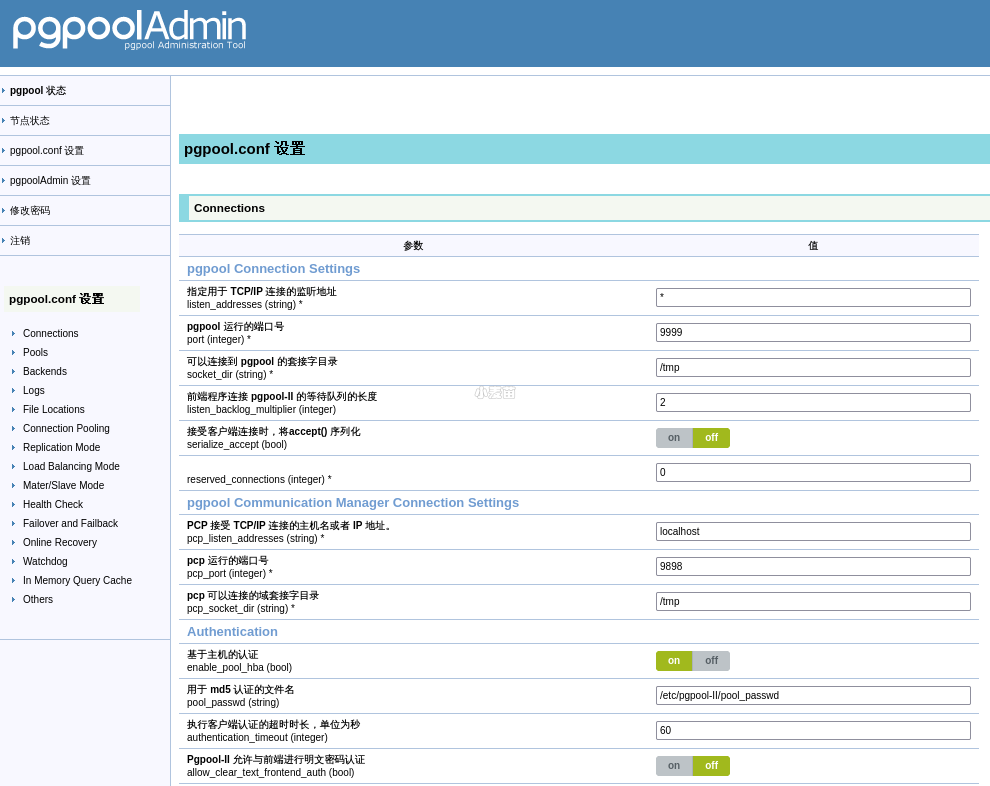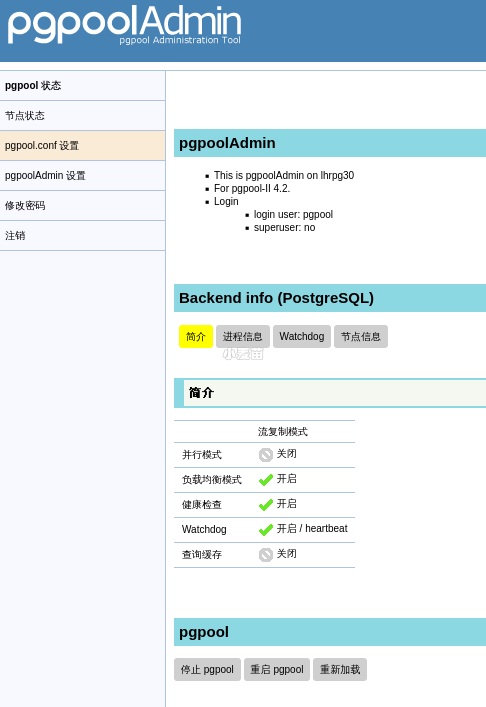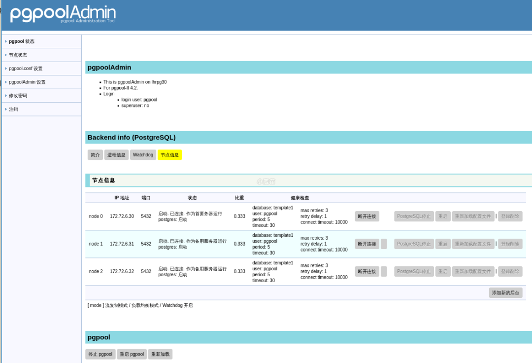 PgpoolAdmin是管理pgpool的WEB界面工具,可以对pgpool进行监控,启停服务,更改设置。