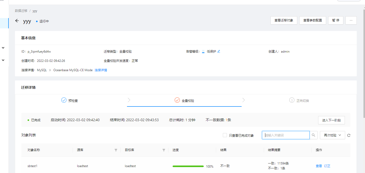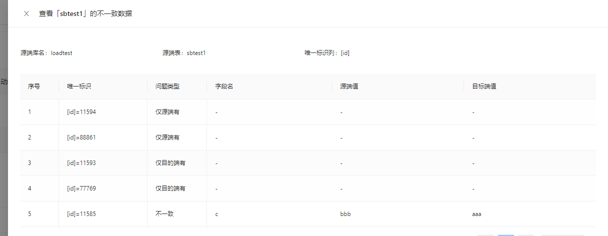 本次分别测试对源数据库部分数据进行修改,仅对目标数据库进行修改,同时对源和目标数据进行修改,构造数据不一致场景,测试OMS数据校验校验功能。