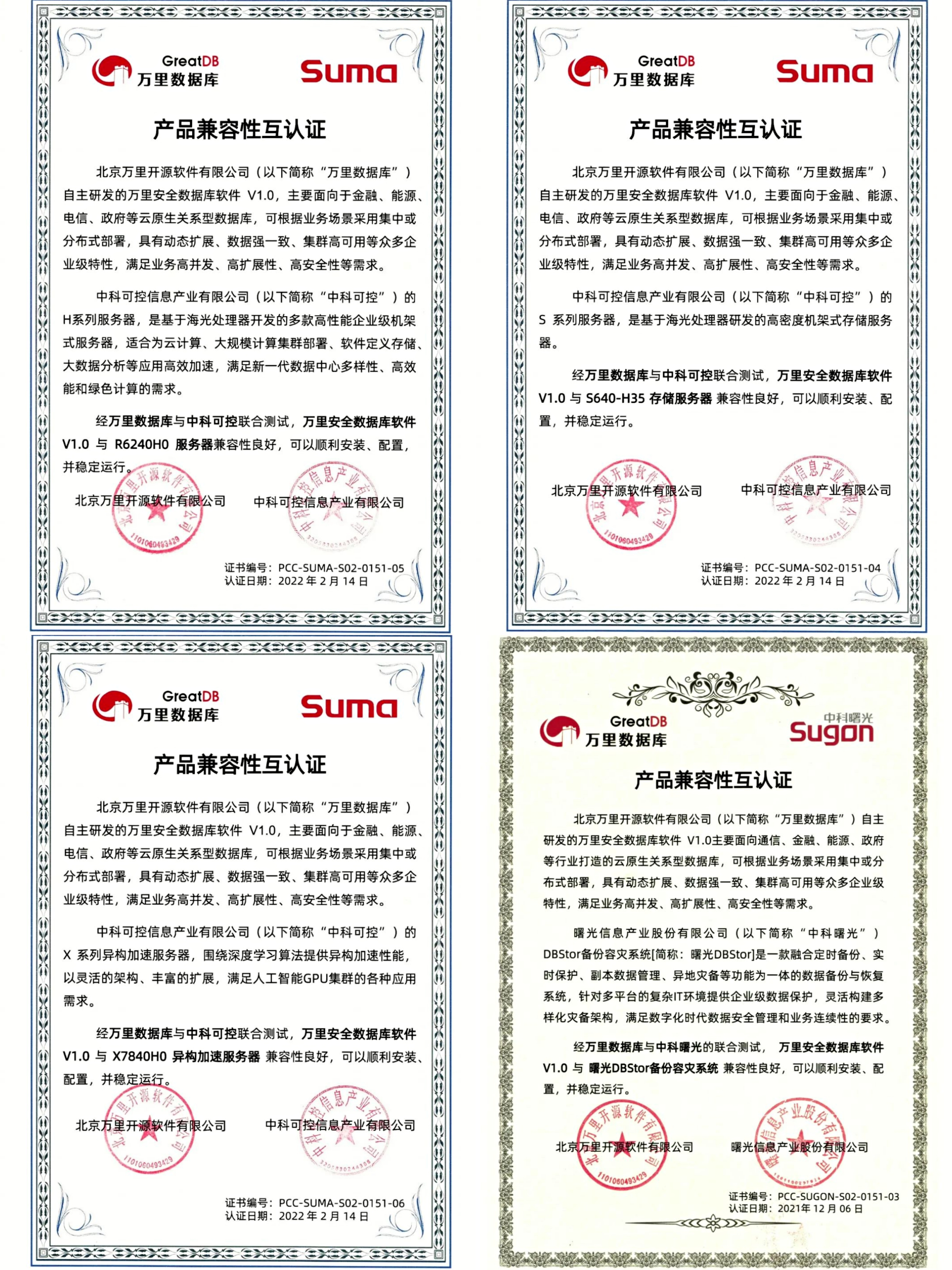 2022开年,万里数据库相继与中科曙光、中科可控旗下多款基于海光芯片的产品完成兼容互认证,即万里安全数据库软件V1.0与中科曙光备份容灾系统、中科可控X系列异构加速服务器、H系列服务器、S系列服务器相互兼容,可以顺利安装、配置,整体运行稳定,性能表现优异。