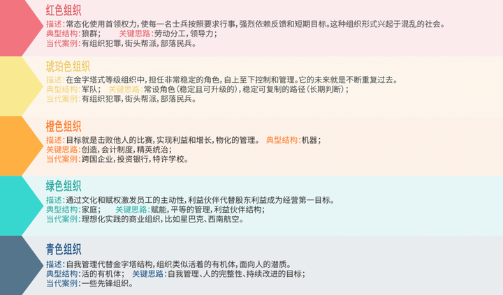雷德里克·莱卢给出的答案是“青色组织”,这是他借用哲学家肯·威尔伯的色层构想而提出一种新兴组织模式,以自我管理和整体性、进化目标等原则为核心,其中,青色组织相比与红色、琥珀色、橙色、绿色组织色层,是更高也更新的一种组织形式。