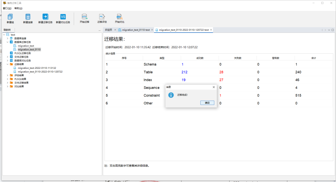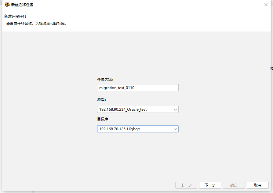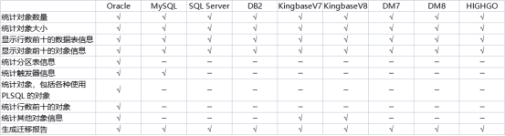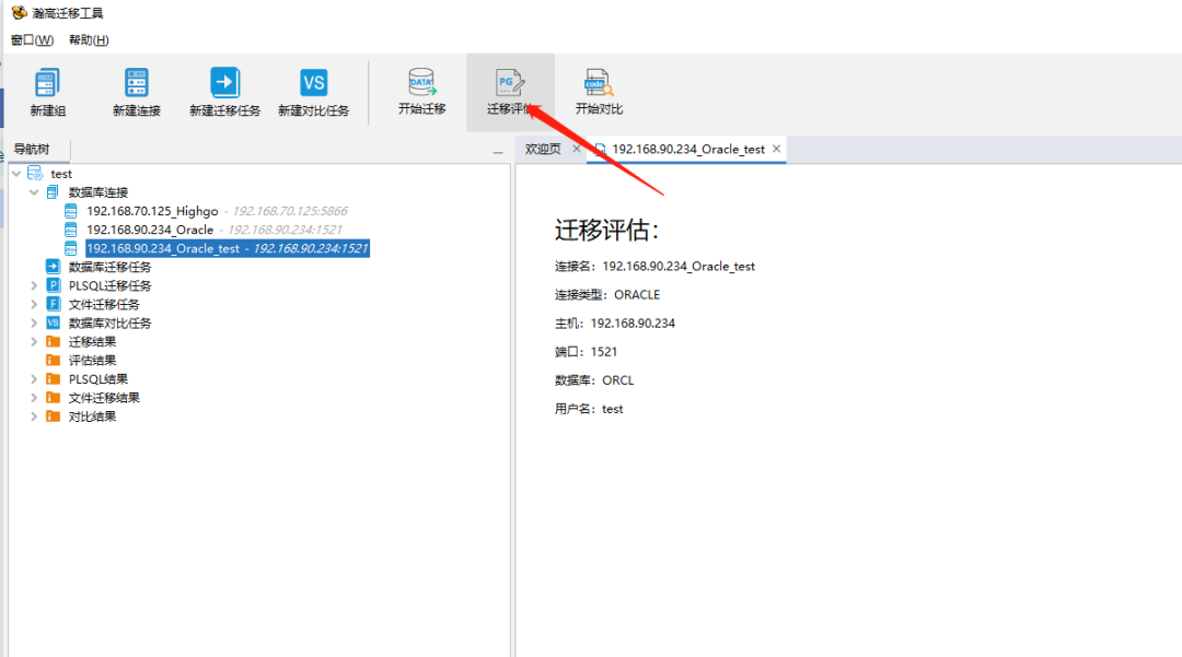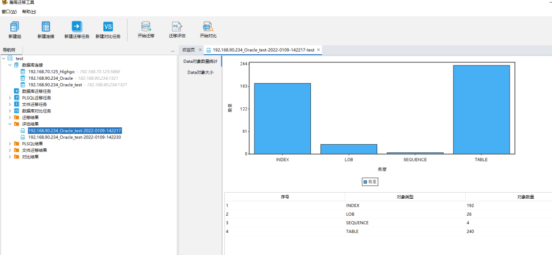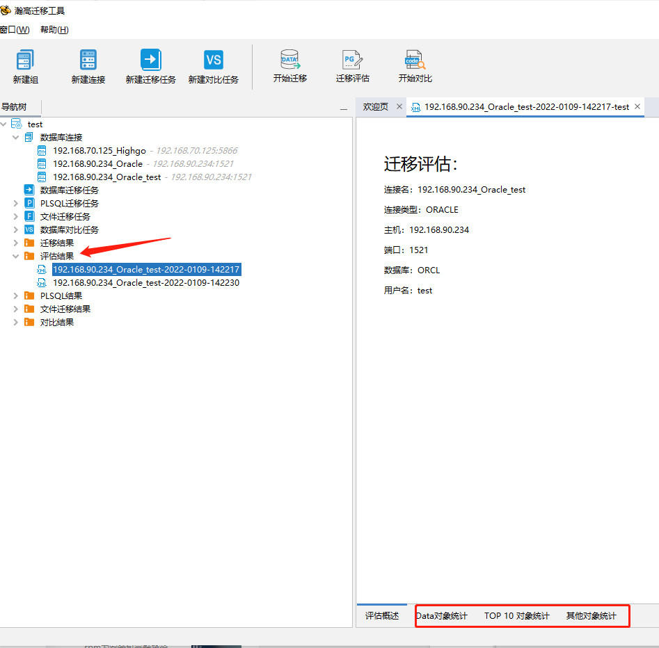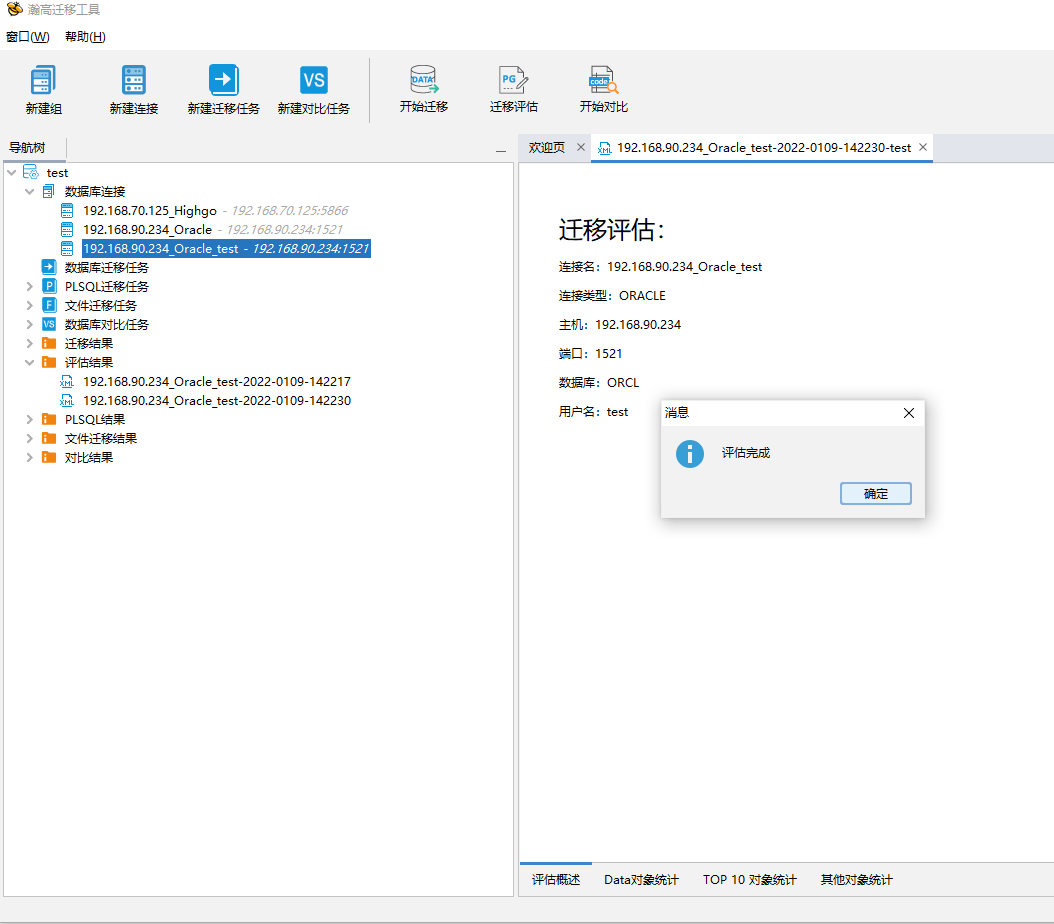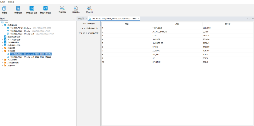 点击新建连接按钮,打开编辑连接界面,以下为编辑连接界面中填写项目的说明:"连接名"是新建连接的名字,为必填项;如果连接名与已有连接相同则会提示;"主机"是连接的 IP 地址,为必填项,默认为"localhost"此为必填项;"端口”是连接的端口号为必填项,默认为"5866”;"数据库”是要连接的数据库,为必填项,默认为"highgo”;"用户名”是连接的用户名,为必填项,默认为"highgo”;在"驱动属性”选项卡中,可以配置连接的驱动属性,如果配置了驱动属性,连接时将会使用设置的驱动属性点击左下方的"新增一行"图标,将新增一行空白行。点击左下方的"删除一行”图标,将删除选中的当前行。新建源端库连接,在工作组中新建源端Oracle数据库连接,根据源库实际信息进行填写,进行连接测试,连接测试成功后保存。新建目标端库连接,在工作组中新建目标端HighGo数据库连接,根据目标端数据库信息进行填写,进行连接测试,连接测试成功后保存。在工作组中进行源端数据库迁移评估,迁移评估完成后会获得相应的迁移评估报告,可根据评估报告进行数据迁移的工作量评估,并辅助制定迁移方案和计划。可以通过下图中标注红框的内容查看,数据评估结果包含以下信息:Data 对象数量统计(对象类型包括:TABLE、INDEX、SEQUENCE、LOB和 SYNONYM)、 Data 对象大小(对象类型包括:TABLE、INDEX、LOBINDEX 和 LOBSEGMENT)、Top10 表行数、Top10 数据对象大小、分区表统计、触发器统计、PLSQL 对象数量统计(对象类型包括:PACKAGE、VIEW、PACKAGE BODY、FUNCTION、PROCEDURE、MATERIALIZED VIEW、TYPE 和 TRIGGER)、TOP 10 PLSQL 对象行数、其他对象统计(其他对象为除 Data对象数量统计包括的对象和 PLSQL 对象统计包括的对象)。当前版本提供Oracle、MySQL、SQL Server、DB2、KingbaseV7、KingbaseV8、DM7、DM8、HIGHGO源端数据库到HIGHGO、PostgreSQL目标端数据库的迁移评估,支持数据库的功能如下列表:在工作中配置迁移工作计划,命名迁移工作名称,在源库和目标库的下拉菜单中选择相应的数据库,点击下一步进入第二页。新建迁移任务中设置迁移模式,上半部分为迁移设置,下半部分为迁移对象模式选择。