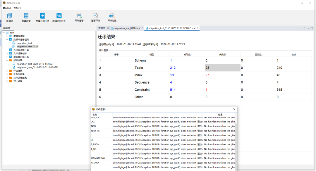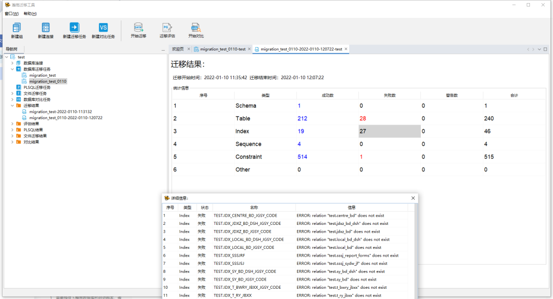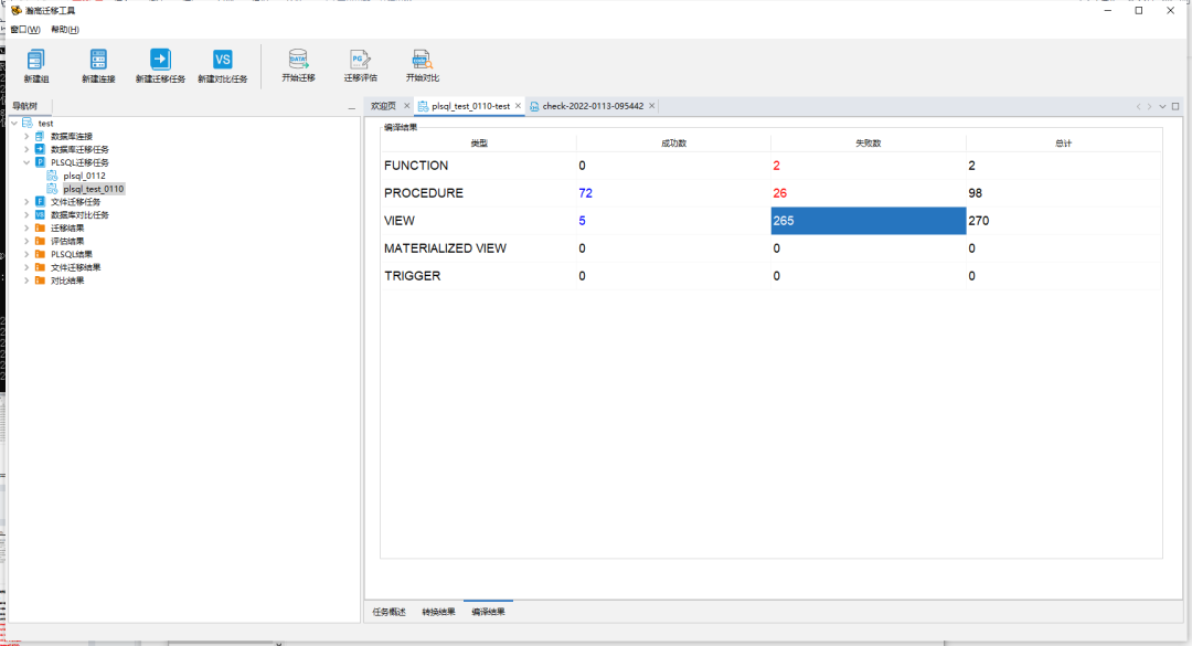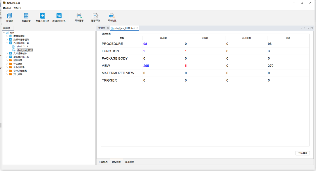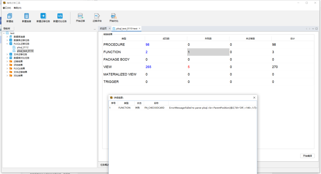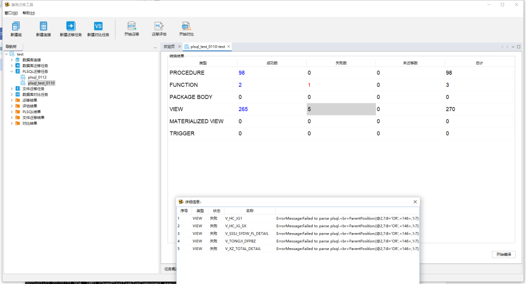 迁移完成后可以通过迁移结果中的展示内容查看具体成功、失败的数据并点击查看细节。所有对象迁移时,目标库中执行的创建SQL语句都会输出到当前..\html\migratefile\create_object_sql_yyyymmddhhmmss文件夹中对应对象的文件中,用户的创建的sql语句的文件名为createSchema.sql、表的创建的sql语句的文件名为createTable.sql、约束的创建的 sql 语句的文件名为 createConstraint.sql、索引的创建的sql语句的文件名为createIndex.sql、序列的创建的sql语句的文件名为createSequence.sql、其他对象的创建的 sql 语句的文件名为 createOther.sql。如下图:所有对象迁移时,失败的对象的完整的错误信息都会输出到..\ html\migratefile\migration_fail_error_yyyymmddhhmmss文件夹中对应对象的文件中,用户的失败错误信息的文件名为migrationSchema.error、表的失败错误信息的文件名为migrationTable.error、约束的失败错误信息的文件名为migrationConstraint.error、索引的失败错误信息的文件名为migrationIndex.error、序列的失败错误信息的文件名为 migrationSequence.error、其他对象的失败错误信息的文件名为 migrationOther.error。如下图:新建PLSQL迁移任务,填写任务名称,选择关联的源库或者选择关联的迁移任务,点击下一步。