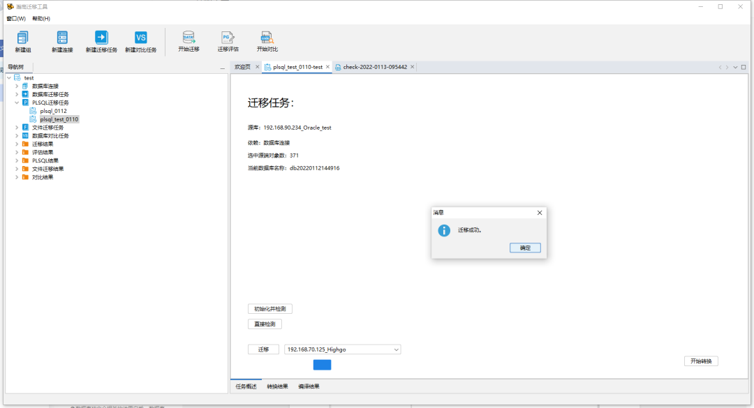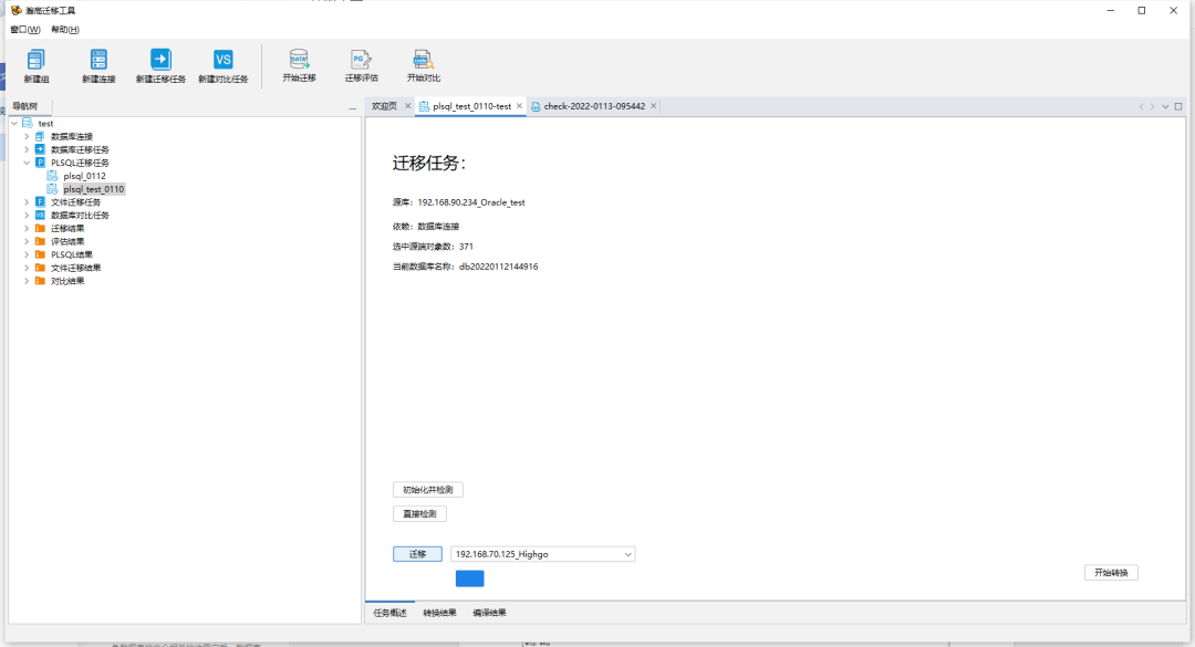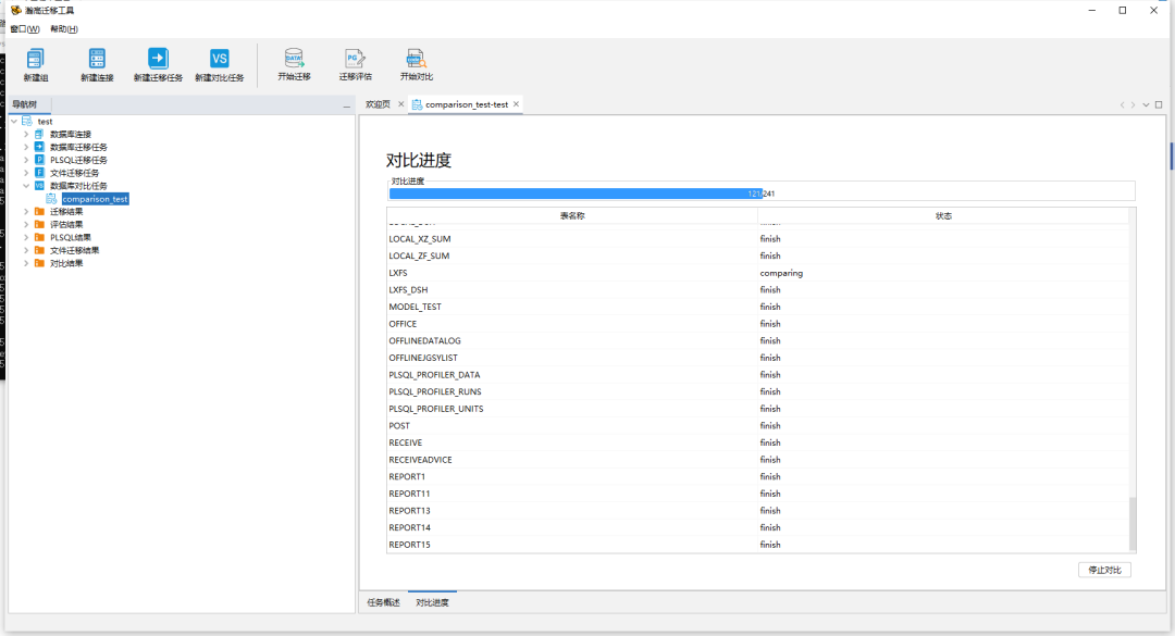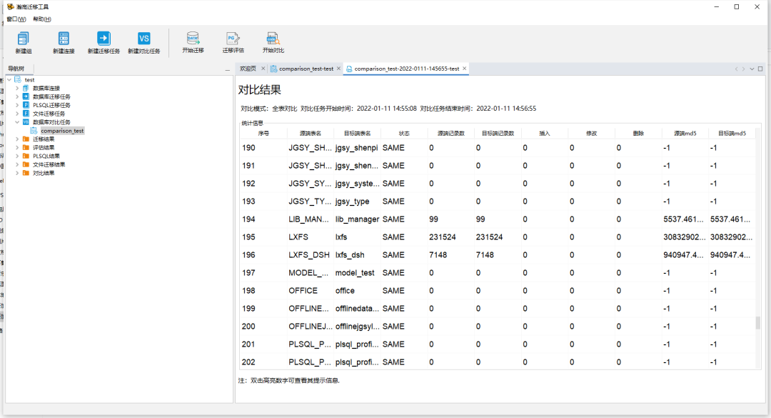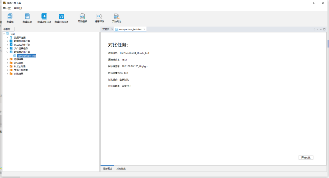当前数据库名称为当前迁移任务所使用的数据库名称,通过操作不同的数据库,来保证 Plsql 执行互不干扰。在工作组中新建数据对比任务,命名对比工作名称,在源库和目标库的下拉菜单中选择相应的源端与目标端数据库。设置对比任务内容,完成设置源端与目标端的模式并设置,对比模式可以选择全表对比或者逐行对比,点击确定后生成对比任务在数据对比任务中选择相应的数据对比任务,开始进行数据对比