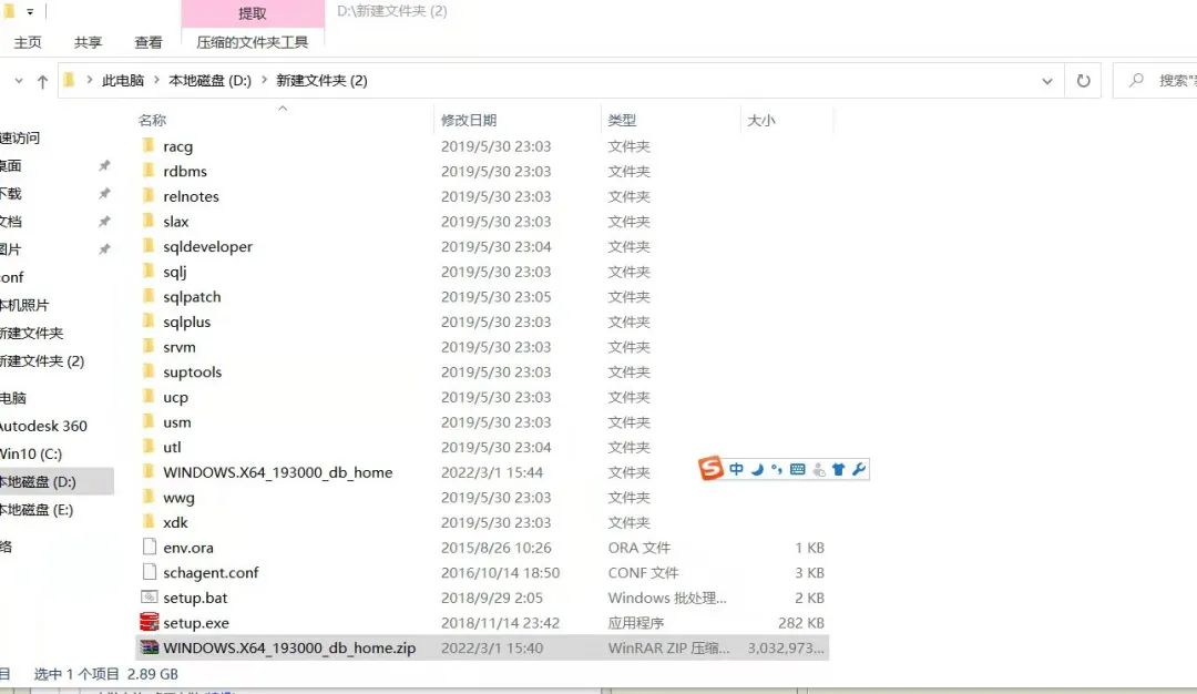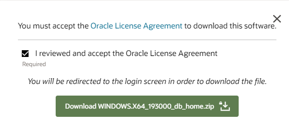 点击下载,选择对勾,点击绿色按钮。随后会让你用Oracle账户登录,没有的话注册一个即可登录。登录后即可下载(注意一定要下载到有存放空间的磁盘上,下载之前先在磁盘上(我用的是E盘)建立一个空文件夹名为Oracle19c,随后把下载的压缩包放在这个文件夹中)