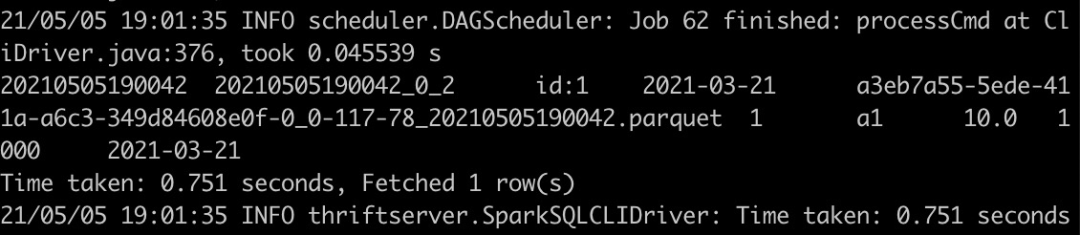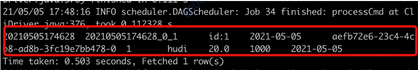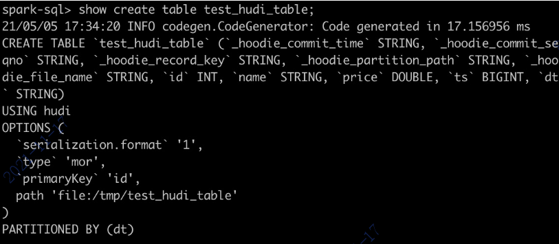SELECT 1 AS id, 'hudi' AS name, 10 AS price, 1000 AS ts, '2021-05-05' AS dt