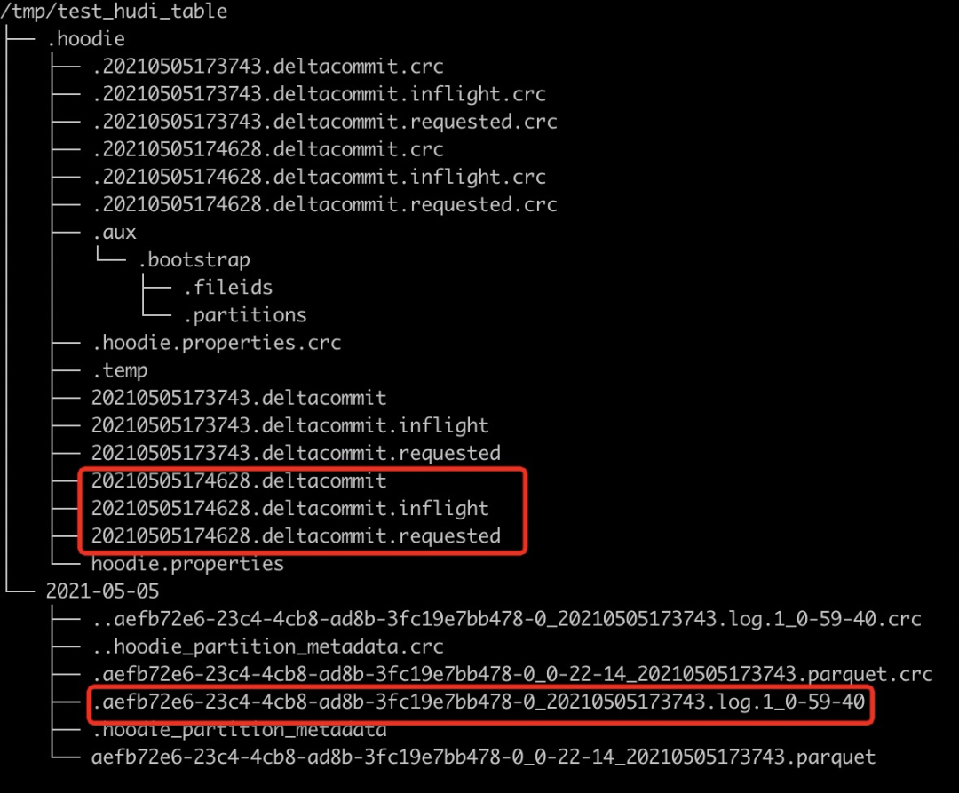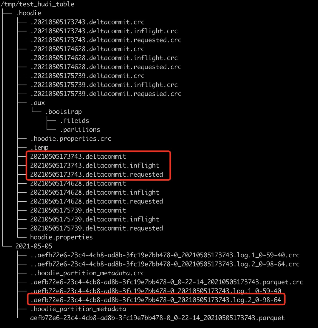 查看Hudi表的本地目录结构如下,可以看到delete之后又生成了一个deltacommit,同时生成了一个增量log文件。