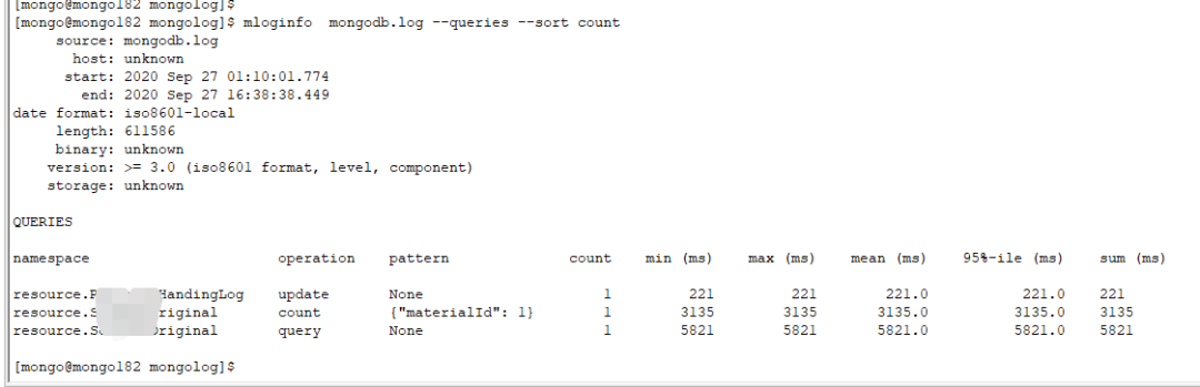 由于在Mongodb中没有绑定变量的概念,所以当业务大量执行慢查询时,system.profile集合中存不了多少数据,且可能大都是不同变量的相同语句,同时在数据库运行日志中会出现慢查询刷屏的现象。在这种情况下,建议使用mtools工具的mloginfo对慢查询进行分析和过滤,结果如下: