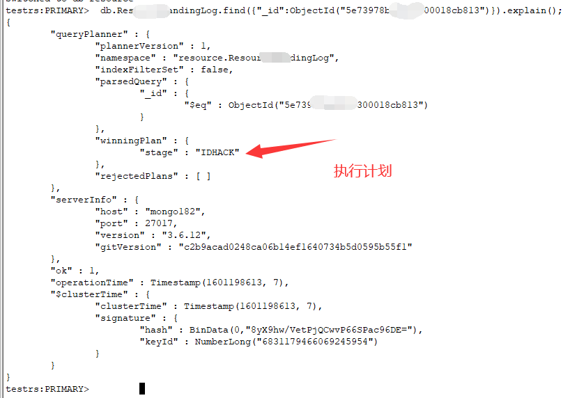db.Text.explain("executionStats").find({"txtId":"5855"});--生成执行计划并执行,显示被拒绝的执行计划,同时显示执行的统计信息