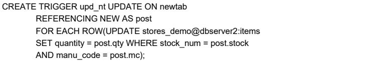 newtab 表上定义了 Update 触发器。此处触发操作在远程 dbserver2 GBase 8s 服务器实例的数