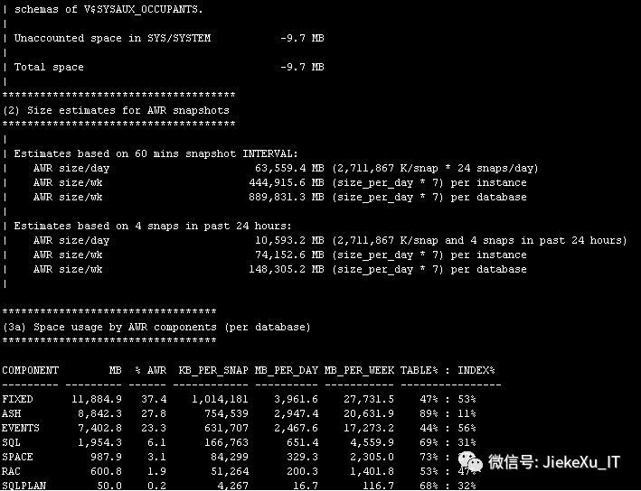 注:awrinfo.sql 是个很不错的工具,第一次使用,这里重点记录一下,使用 ?/rdbms/admin/awrinfo.sql 可以查看 awr 的数据使用情况。