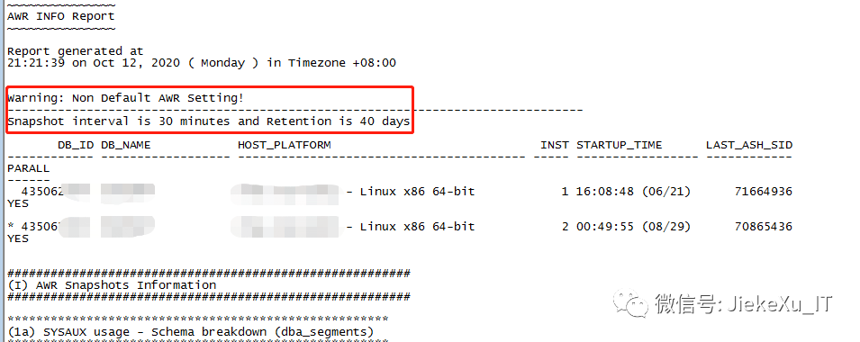 开头显示 AWR 的设置信息,快照保留 40 天,每隔 30 分钟生成一个快照。后边便是一些对象占用的大小以及明细。