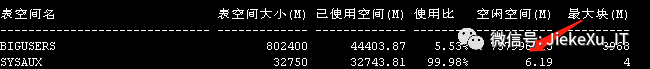 通过查询可得知目前表空间使用情况如下图:可看到 SYSAUX 表空间和 SYSTEM 表空间使用率都已经高达99%,SYSAUX 表空间甚至只剩下 6.19MB 的空间。