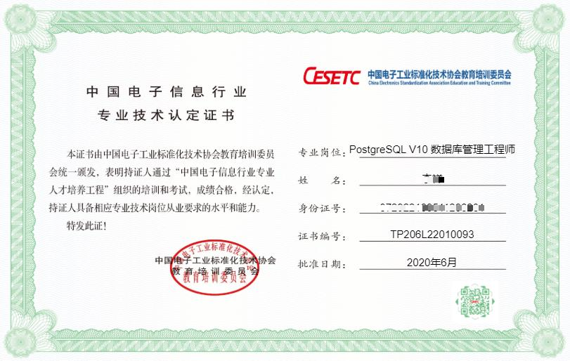 本次考试合格考生将授予 “中国PostgreSQL认证考试技术能力证书“ 和 “中国电子信息行业专业技术认定证书”。