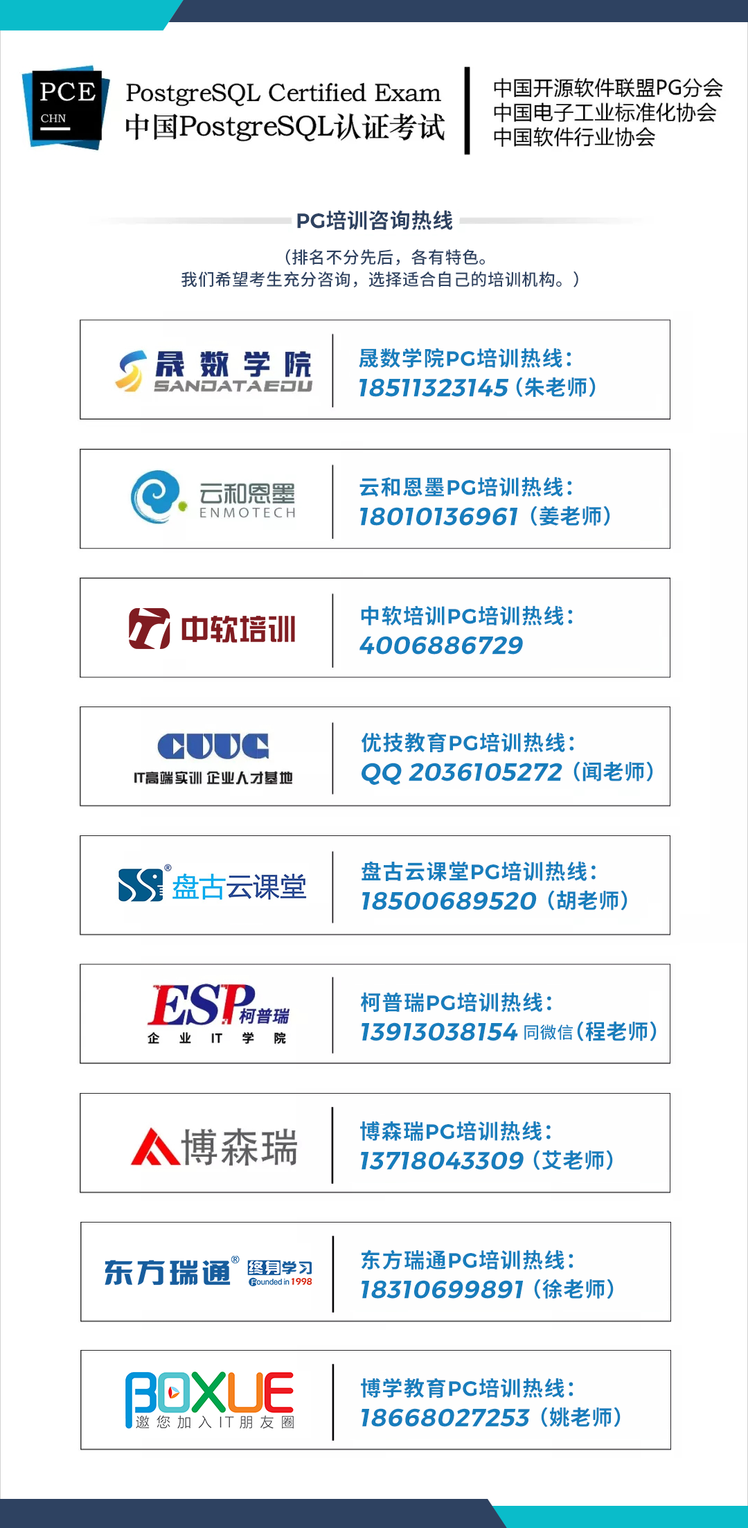 鉴于业界的心声和呼声,由中国开源软件联盟PostgreSQL分会携手工信部中国电子工业标准化技术协会、专业培训机构联合打造的“中国PostgreSQL培训和技术能力认证体系”于2019年正式发布,并列入“中国电子信息行业专业人才培养工程”之中。其目的是为国内IT从业者提供PostgreSQL技术培训服务,并科学、公正地对从业人员进行职业资格、专业技术资格认定和专业技术水平测试。