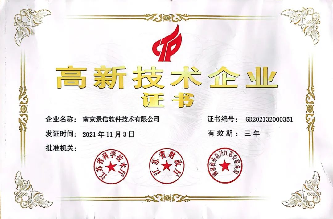 2022年3月,南京录信软件技术有限公司收到了国家科技部正式下发的“高新技术企业证书”,正式成为国家高新技术企业。