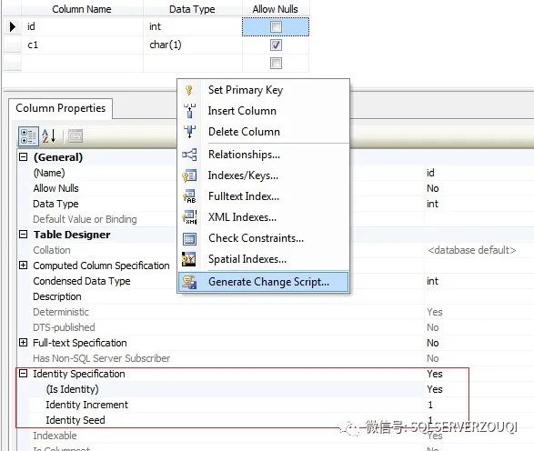 对表上已存在列添加IDENTITY属性,生成的脚本如下: