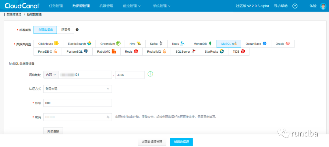 数据源管理 -> 新增数据源 -> 自建数据库 -> MYSQL,