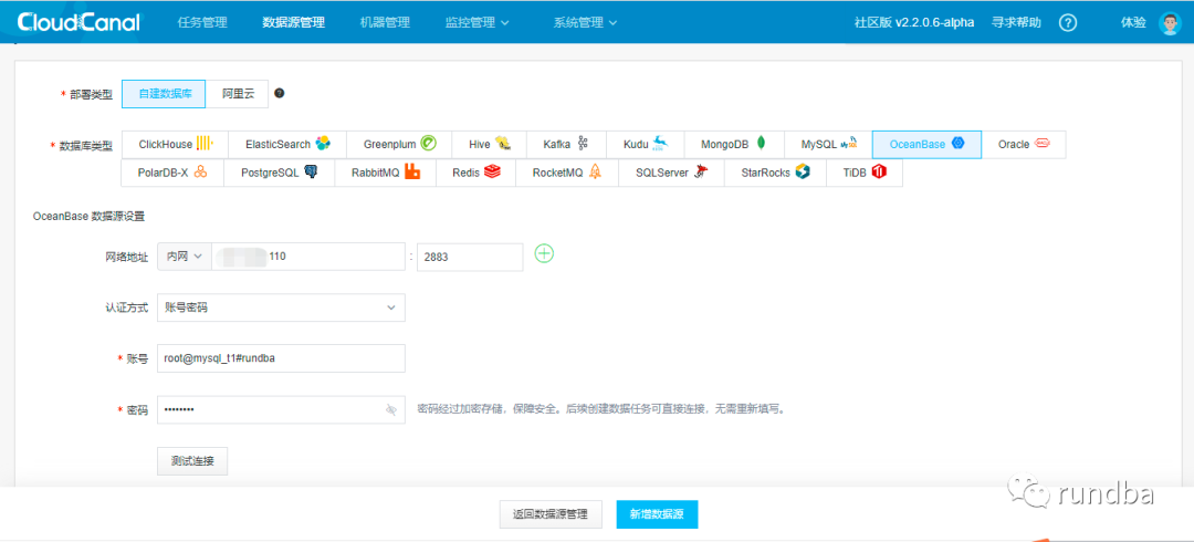 数据源管理 -> 新增数据源 -> 自建数据库 -> OceanBase,