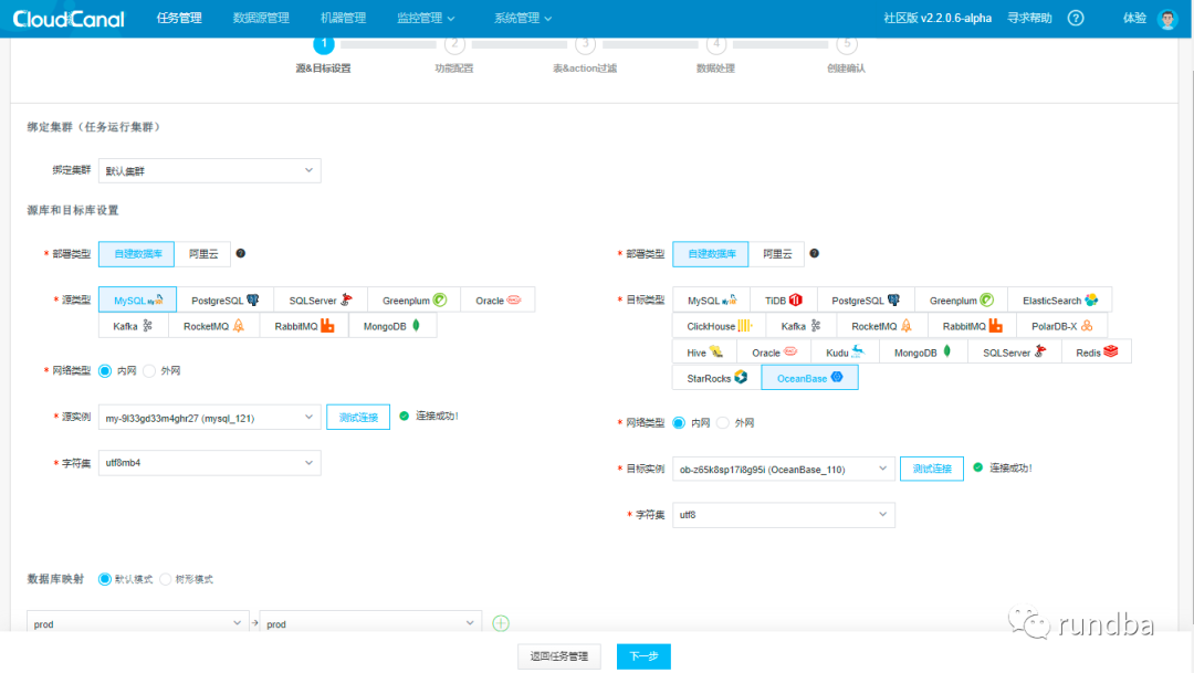 目标实例:选择前面创建的OceanBase数据源ob-z65k8sp17i8g95i(OceanBase_110),点击“测试连接”,直到提示成功。