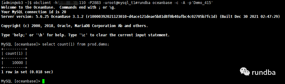 [admin@ob3 ~]$ obclient -h192.168.80.110 -P2883 -uroot@mysql_t1#rundba oceanbase -c -A -p'Demo_415'Welcome to the OceanBase. Commands end with ; or \g.Your MySQL connection id is 20Server version: 5.6.25 OceanBase 3.1.2 (r10000392021123010-d4ace121deae5b81d8f0b40afbc4c02705b7fc1d) (Built Dec 30 2021 02:47:29)Copyright (c) 2000, 2018, Oracle, MariaDB Corporation Ab and others.Type 'help;' or '\h' for help. Type '\c' to clear the current input statement.MySQL [oceanbase]> select count(1) from prod.demo;+----------+| count(1) |+----------+| 10000 |+----------+1 row in set (0.018 sec)